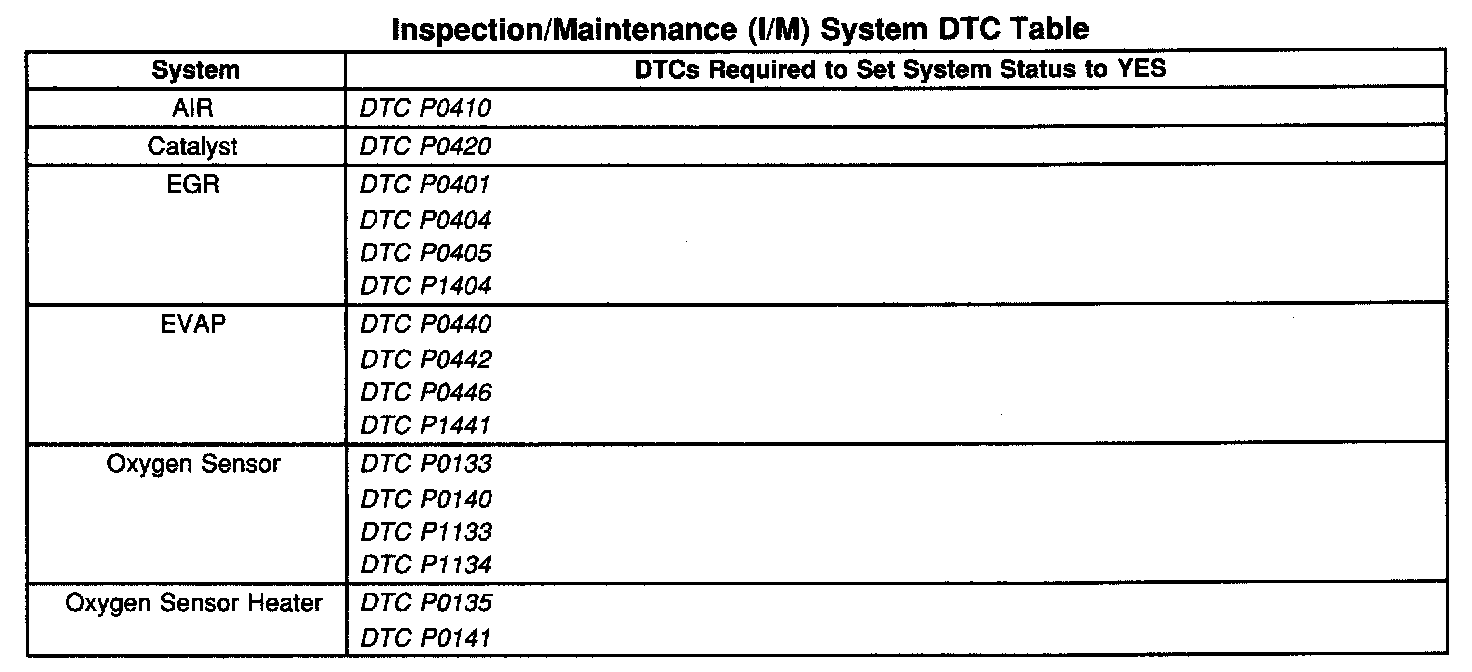 Inspection/Maintenance (I/M) System DTC Table: