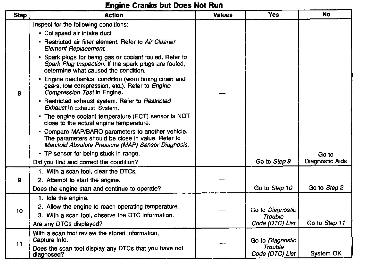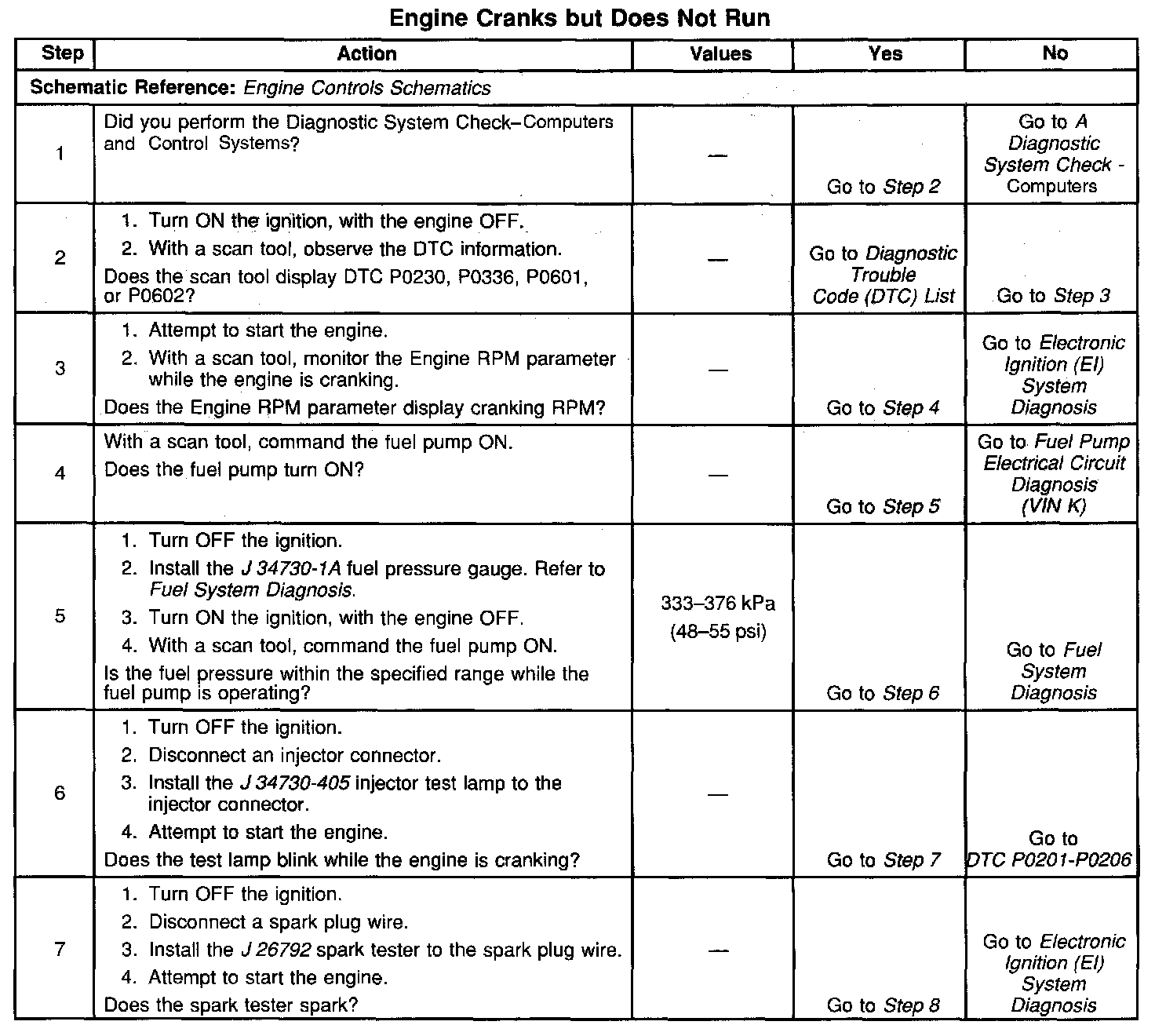 The table will isolate the failed system and lead to the correct diagnostic procedure.
