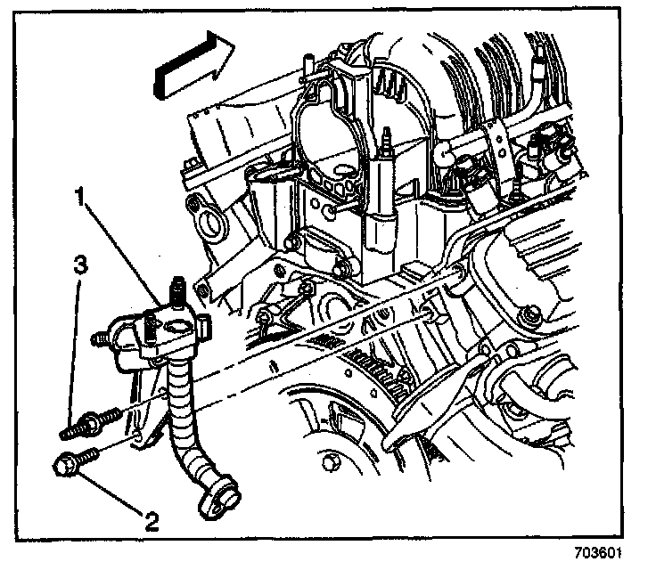 4. Remove the mounting bolt (2) and the stud (3) from the EGR valve adapter pipe bracket.