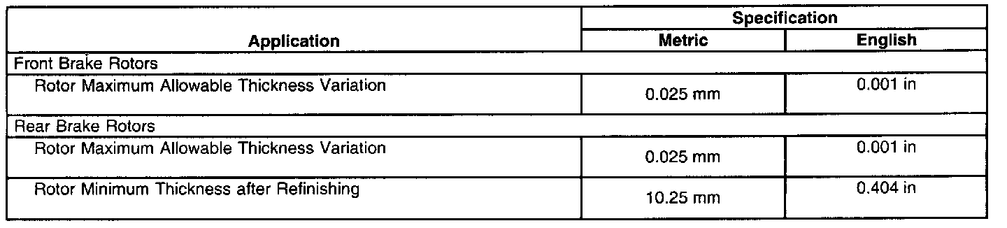 This bulletin is being issued to revise the Disc Brake Component Specifications in the Disc Brakes sub-section of the Service Manual. Please replace the current information in the Service Manual with the following information.
