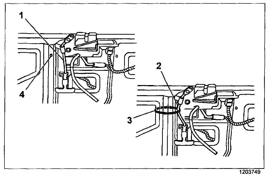 5. Install a plastic tie strap (3) that is 200 mm (8 in) or longer through the hole (4) in the sheet metal and around the cable as shown. Pull the tie strap snug.