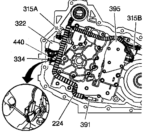 2. Use a small flat-bladed tool in order to remove the wiring harness from the solenoid valve(s) (315A, 315B, 322, 334 and/or 440), TFP manual valve position switch (395) and/or the temperature sensor (391).