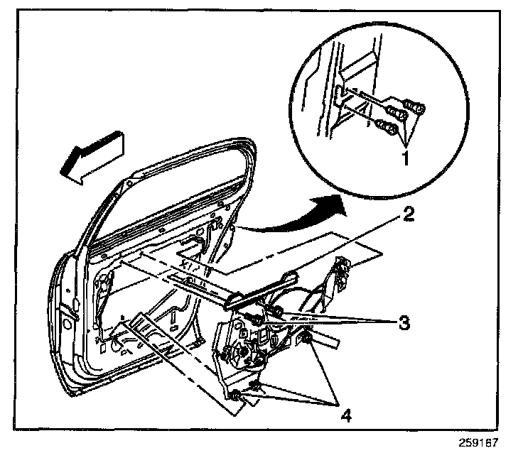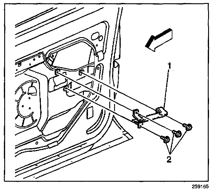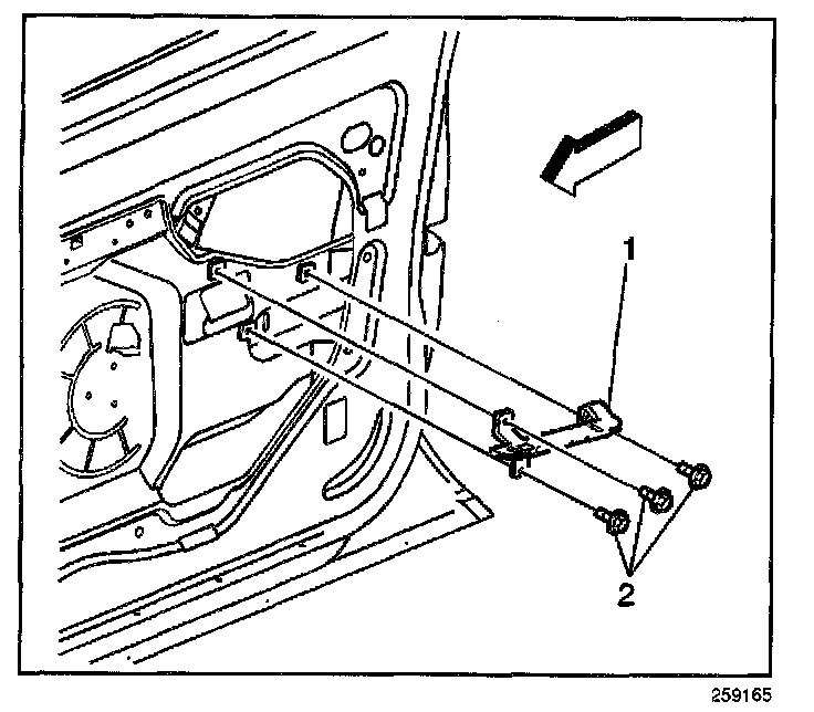 7. Lower the window in order to gain access to the front window clamp through the access hole (2).