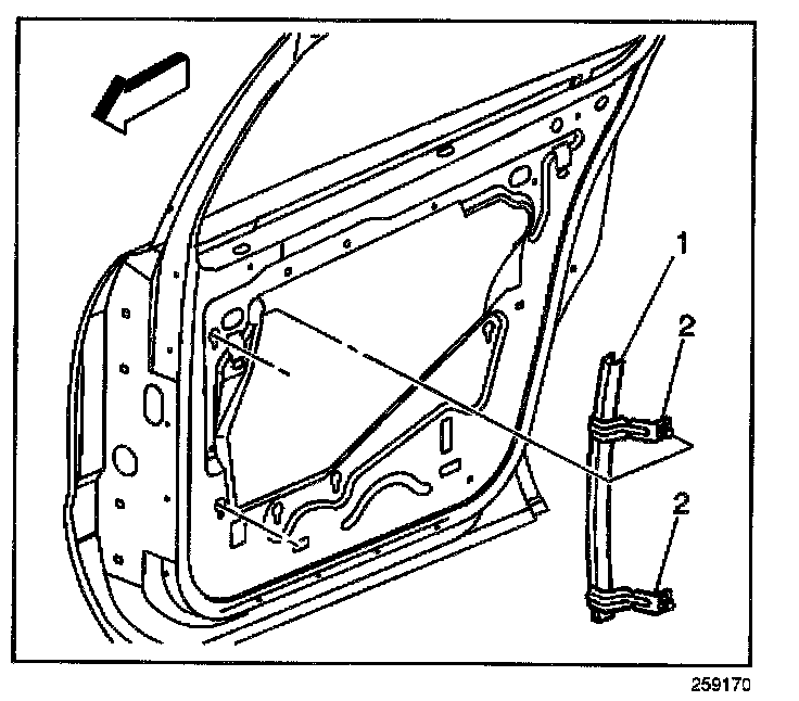4. Loosen the 2 front window run channel bolts (2).