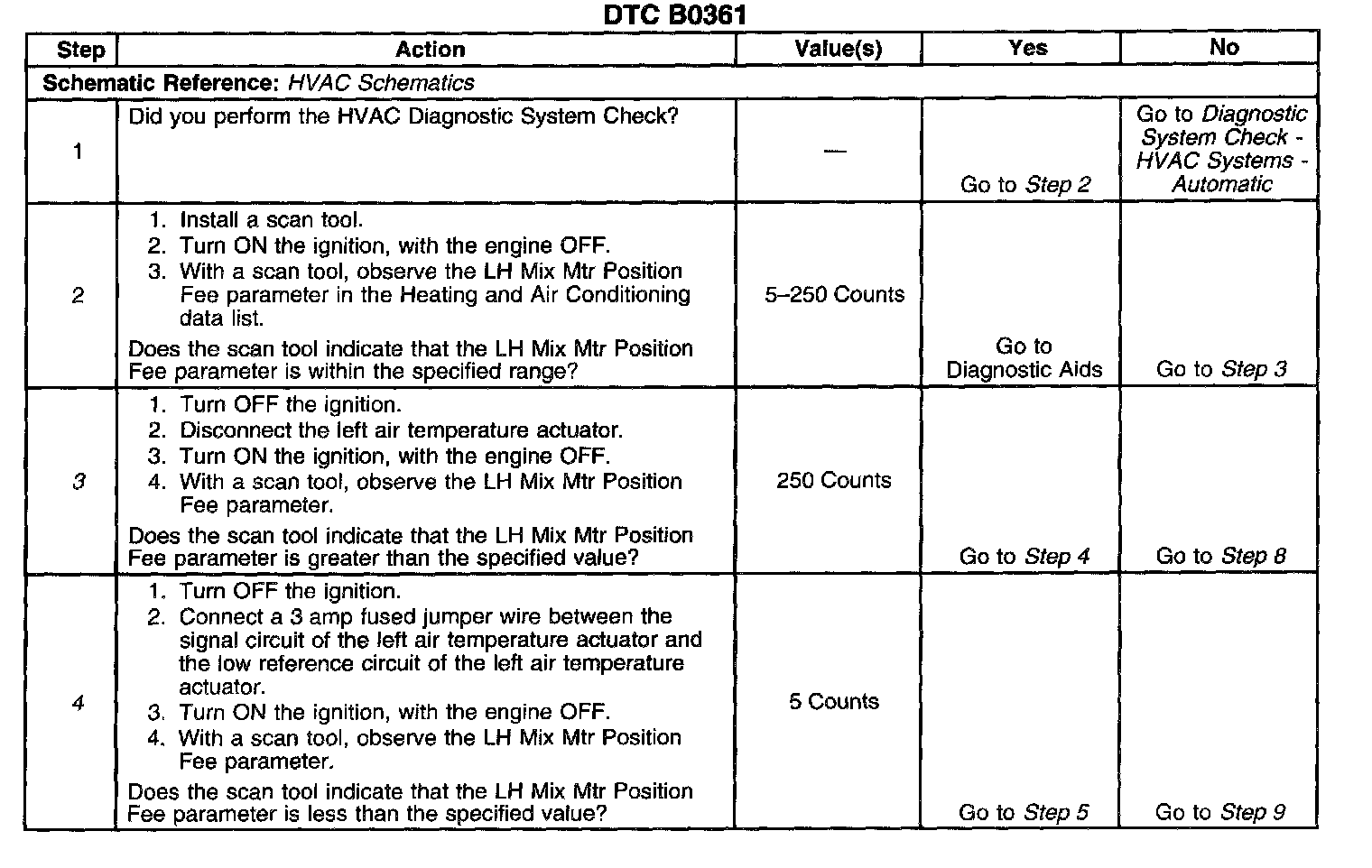 Install a scan tool to the diagnostic link connector. Turn the ignition switch to the ON position. Select the OUTPUT CONTROL screen in HVAC special functions. Use the MISCELLANEOUS TEST screen to manually drive the left air temperature actuator with the scan tool from fully open to fully closed. Monitor the LH MIX MTR POSITION FEE with the scan tool when this is done. A normal position feedback signal should range between 0-255 counts as the electric actuator is being moved.