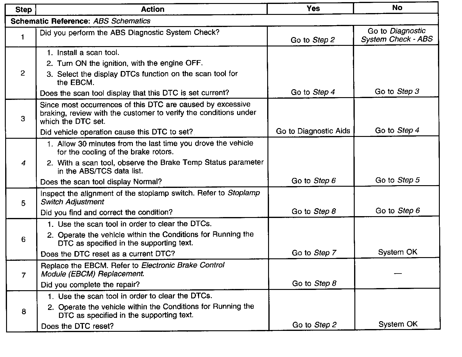 This DTC sets when the estimated brake rotor temperature of either of the drive wheels exceeds 375°C (700°F). When the estimated brake rotor temperature of either of the drive wheels exceeds 375°C (700°F) during normal braking or normal ABS operations, the DTC does not set until the next TCS activation. The brake rotor temperature can exceed 375°C (700°F) without setting the DTC if a TCS activation has not occurred. When the estimated brake rotor temperature of either of the drive wheels exceeds 375°C (700°F) during a TCS activation, the DTC sets immediately, but the EBCM does not disable TCS until the end of the TCS event.