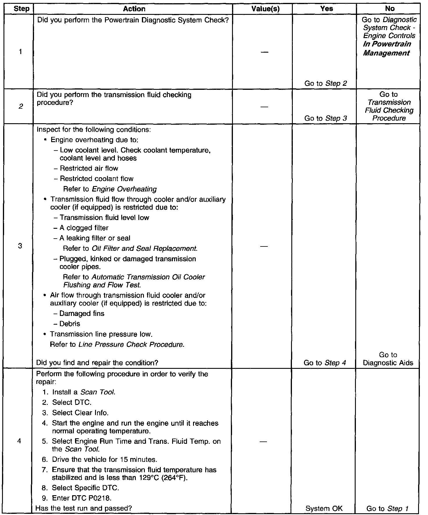 When the powertrain control module (PCM) detects high transmission fluid temperature for an extended period of time, then DTC P0218 sets. DTC P0218 is a type C DTC.