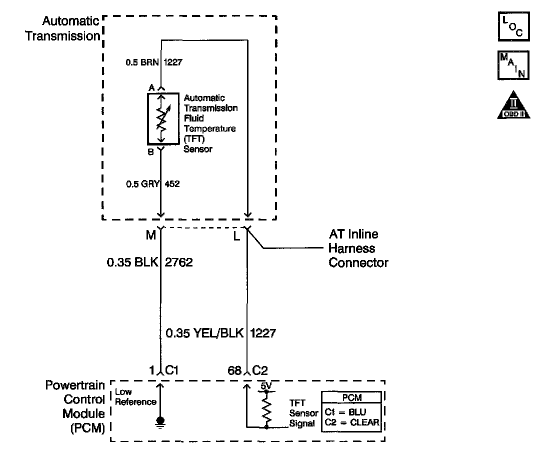 The automatic transmission fluid temperature (TFT) sensor is a negative coefficient thermistor whose resistance value changes based on temperature. The PCM provides a 5 volt reference to the sensor. A low fluid temperature, an open TFT sensor or sensor circuit results in high signal voltage. The TFT operating range is -40°C to +151°C (-40°F to +304°F).
