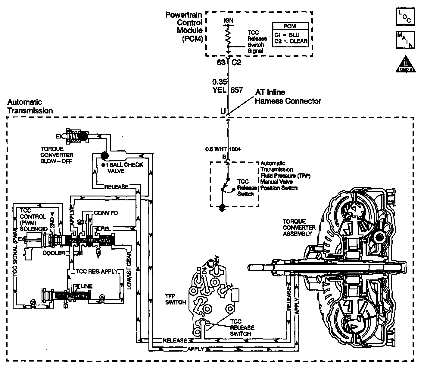 The TCC release switch Is a normally-closed switch. When the TCC is released, TCC release fluid pressure opens the TCC release switch which opens the TCC release pressure circuit. When the voltage on the circuit is high (switch open), the PCM recognizes that the TCC is no longer engaged.