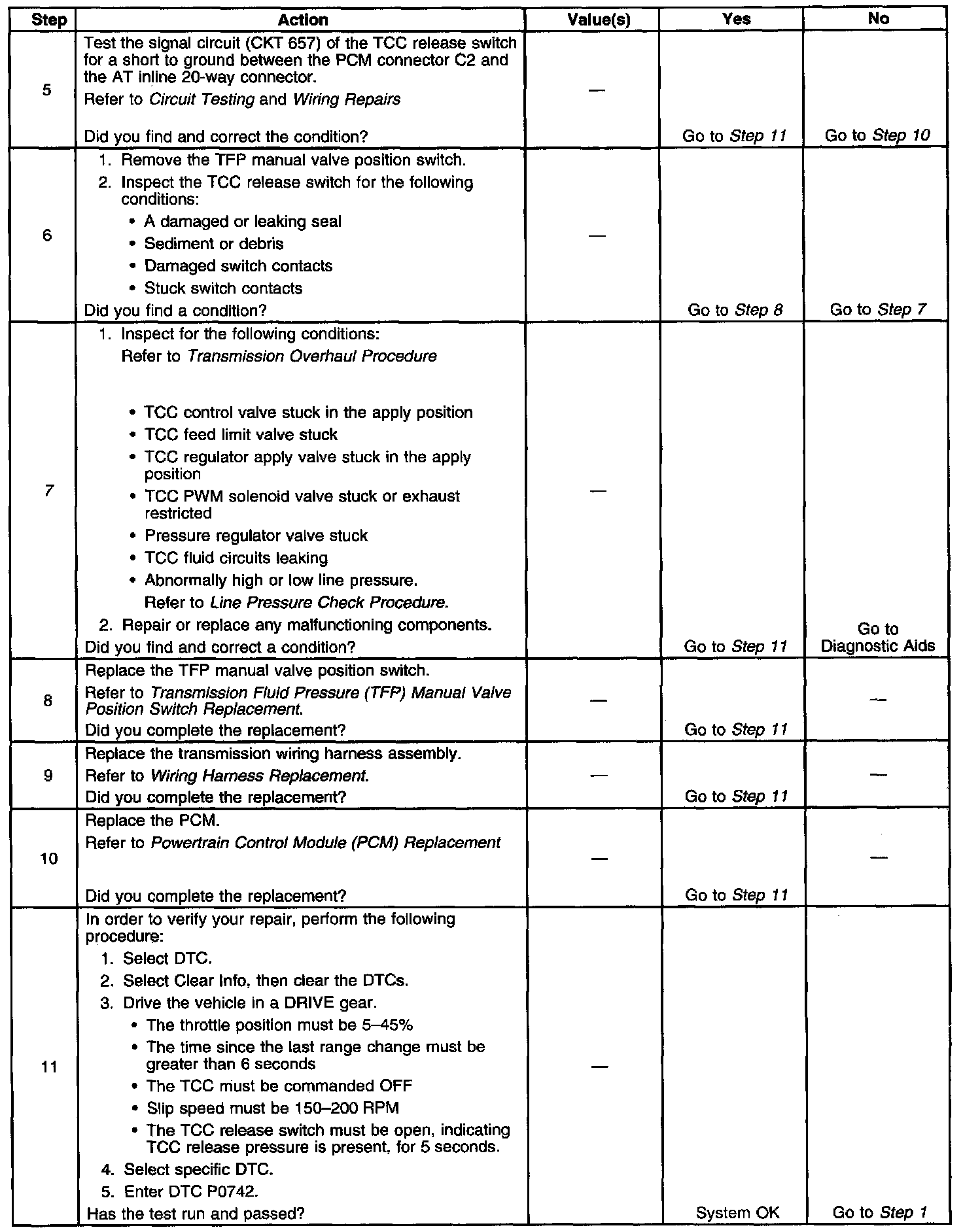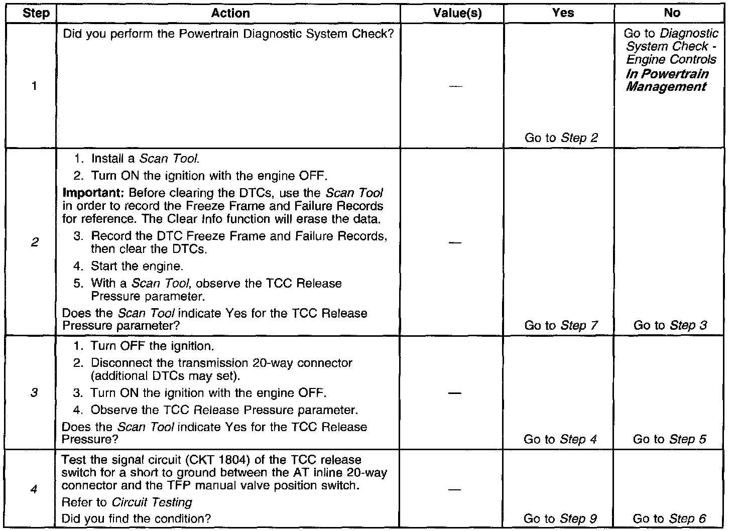 ^ If the Scan Tool indicated TCC release pressure was present in Step 2 and a mechanical or hydraulic condition was not found in Step 7, an intermittent short to ground condition may exist in the TCC release switch signal circuit.