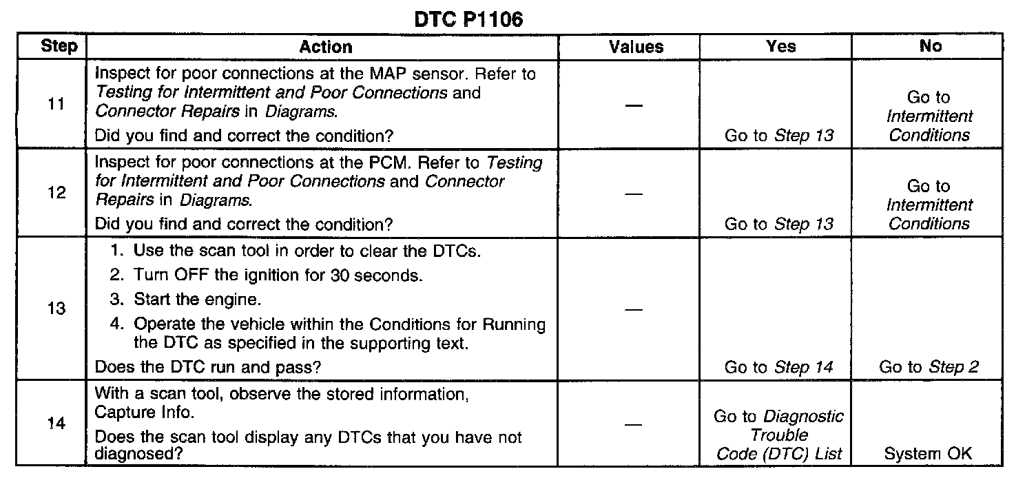 CIRCUIT DESCRIPTIONThe Manifold Absolute Pressure (MAP) sensor responds to changes in intake manifold pressure which gives an indication of the engine load. The MAP sensor has a 5-volt reference circuit, a low reference circuit, and a signal circuit. The PCM supplies 5 volts to the MAP sensor on the 5-volt reference circuit, and provides a ground on the low reference circuit. The MAP sensor provides a signal to the PCM on the signal circuit which is relative to the pressure changes in the manifold. With low manifold absolute pressure such as during idle or deceleration, the PCM should detect a low MAP sensor signal voltage. With high manifold absolute pressure such as wide-open throttle, the PCM should detect a high MAP sensor signal voltage. This MAP sensor will indicate pressure between 8-208 kPa. The MAP sensor is also used in order to calculate the Barometric Pressure (BARO) when the ignition switch is turned ON, with the engine OFF. The PCM monitors the MAP sensor signal for voltage outside of the normal range. If the PCM detects a MAP sensor signal voltage that is intermittently high DTC P1106 will set.