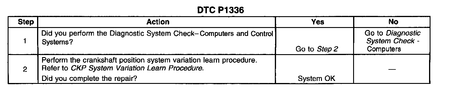 The crankshaft position system variation values are stored in the PCM non-volatile memory after a learn procedure has been performed. If the crankshaft position system variation values have not been stored in the PCM, DTC P1336 will set. The learn procedure is required after the following service procedures have been performed: