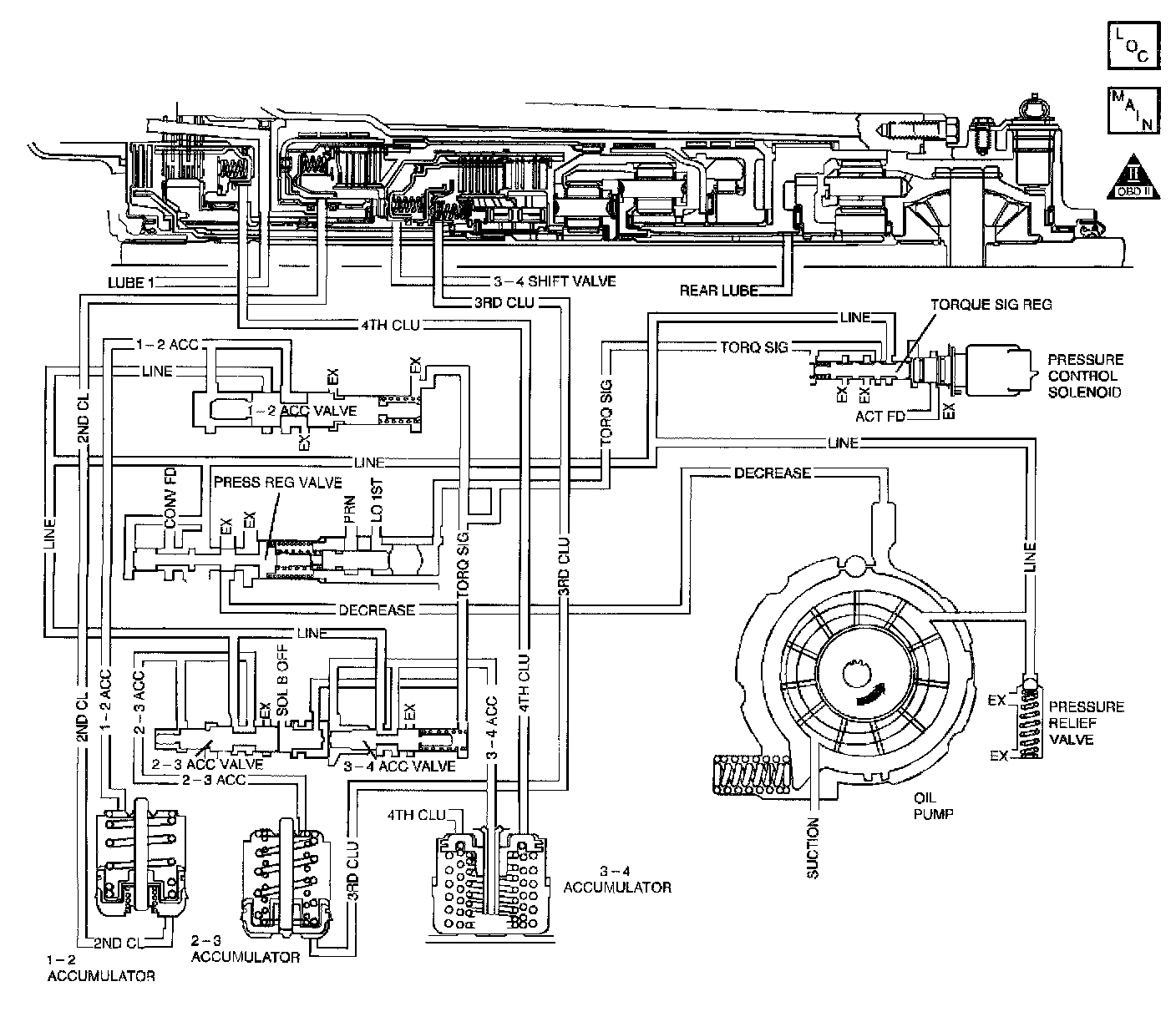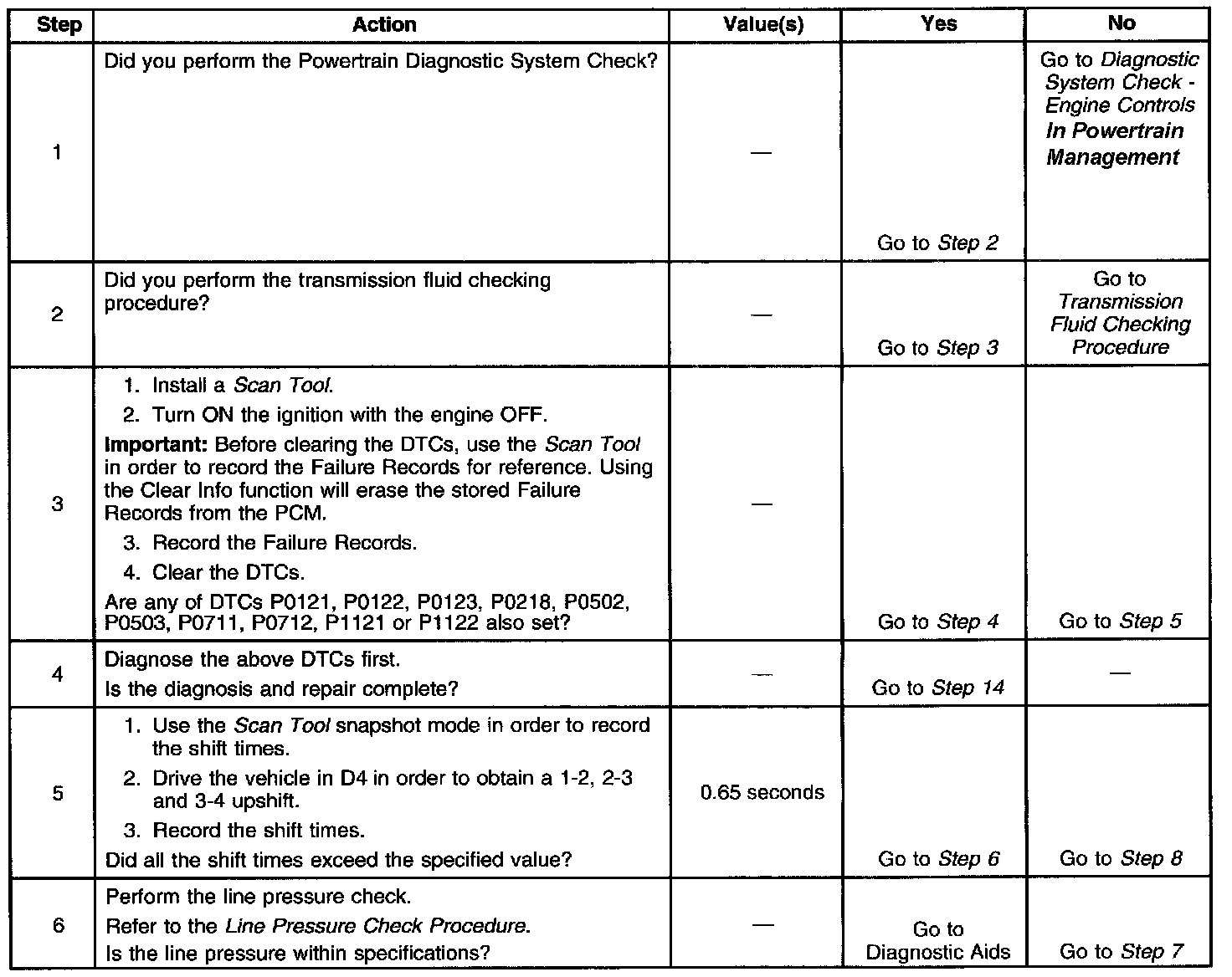 The transmission pressure is modified by an adaptive modifier which controls the shift execution time. This diagnostic tests the time required to accomplish the shift. If the shift takes longer than 0.65 seconds and the adaptive modifier cannot shorten this time, then a counter increases by one.