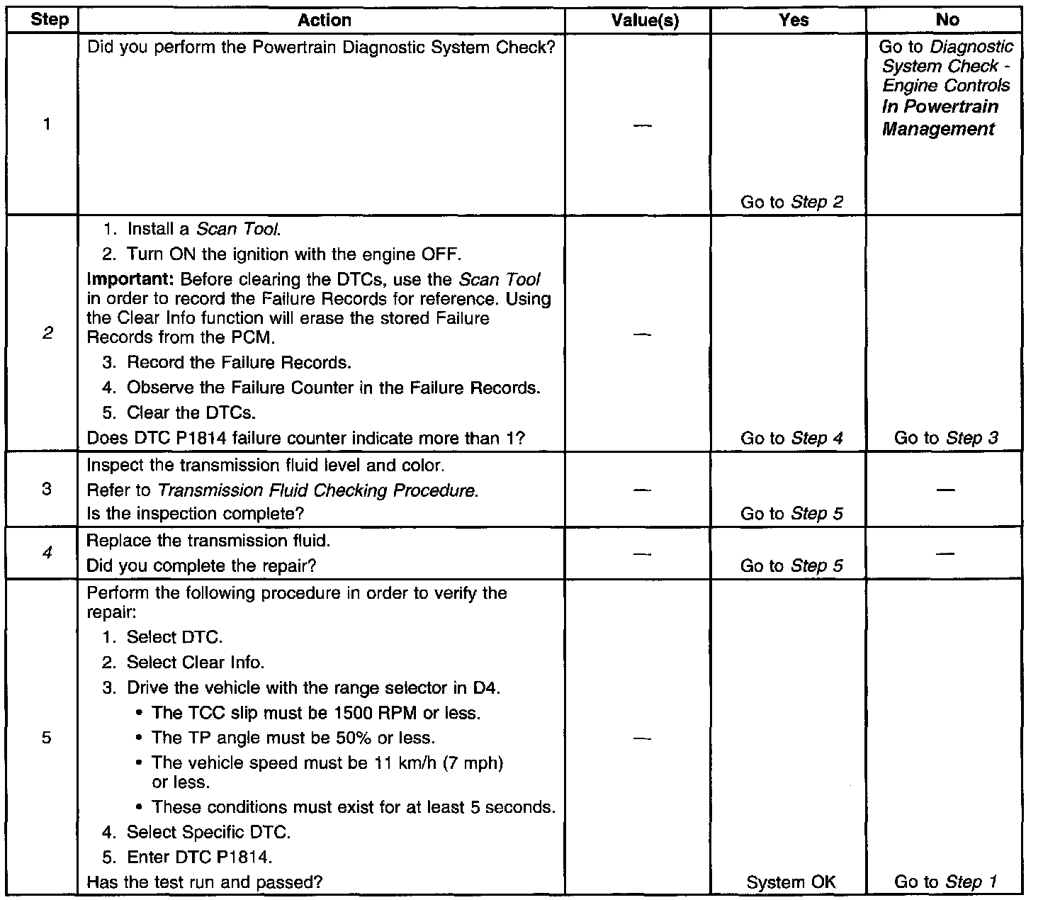 4. This step replaces the fluid and the filter. If DTC P1814 occurs more than once in the Failure Records, severe TCC damage may have occurred.