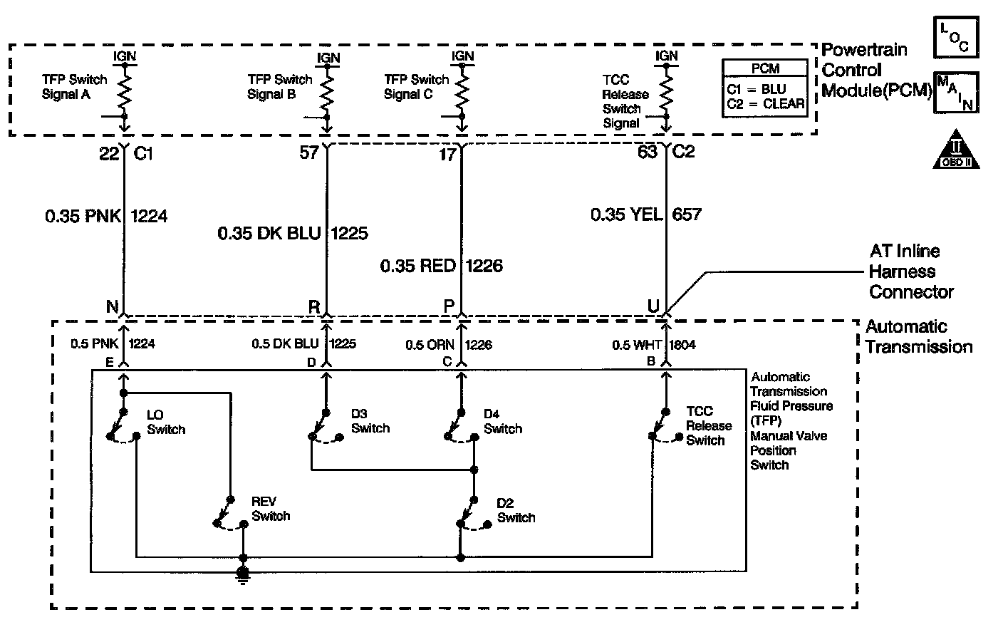 The TCC release switch is part of the transmission fluid pressure (TFP) manual valve position switch. The TFP manual valve position switch is mounted to the transmission valve body. The TCC release switch is normally-closed. The switch signals the PCM that the TCC is released.This is accomplished by torque converter release fluid pressure acting on the switch contact which opens the circuit. When the circuit voltage is high, the PCM recognizes that the TCC is no longer engaged.