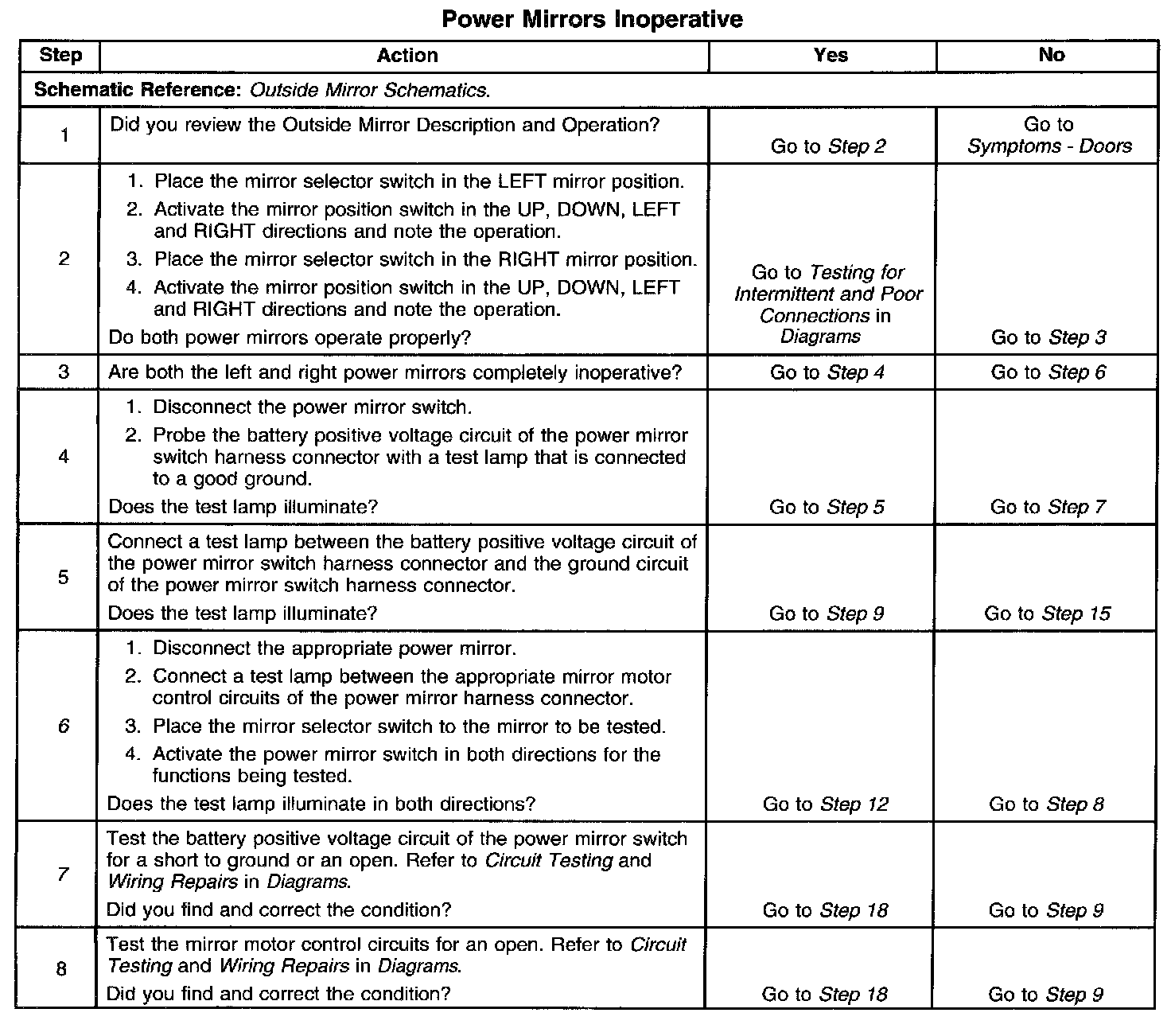 6. This step tests the integrity of both the mirror control circuits and the power mirror switch. If both power mirrors are inoperative on one or more axis, begin testing by disconnecting one of the power mirrors, if an open circuit is detected and repaired for that power mirror, repeat step 6 for the other power mirror.