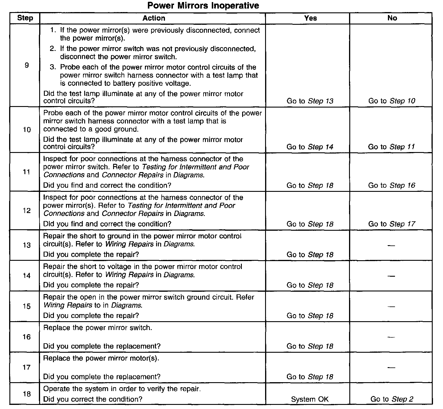 ^ If both power mirrors are inoperative on one or more axis, the most probable cause is a power mirror switch failure. However the fault could be an open circuit on two or more of the power mirror control circuits.