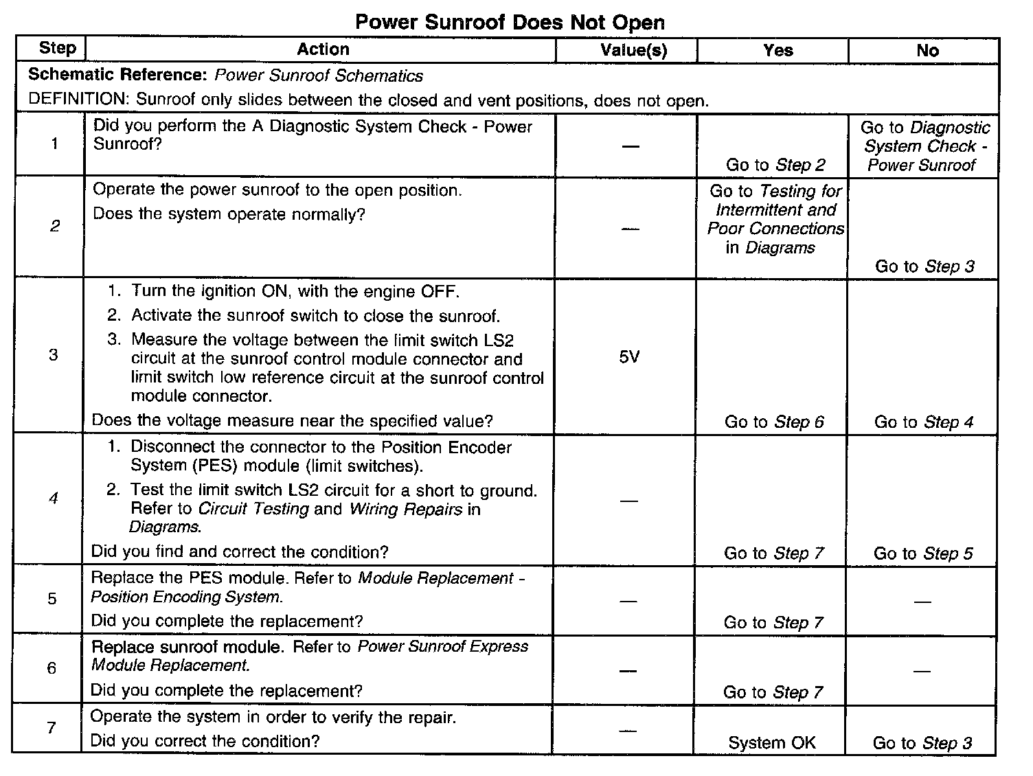 2. This step will test the if the sunroof will slide to the open position. If it opens, then inspect the limit switch LS2 for a stuck switch causing an intermittent short to ground.
