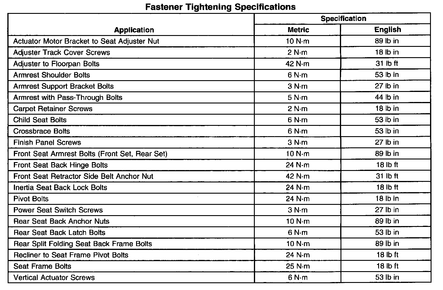 Fastener Tightening Specifications: