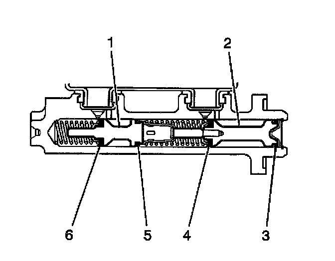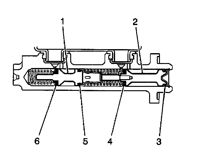 9. Plug the cylinder inlet ports and the rear outlet port. Apply low pressure, non-lubricated, filtered air into the front outlet port, in order the remove the secondary piston (1) with the primary (6) and secondary (5) seals, and the return spring.