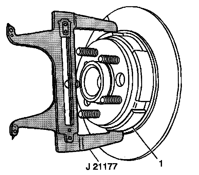 8. Set the J21177-A inside of the park brake drum (1) at the widest point.