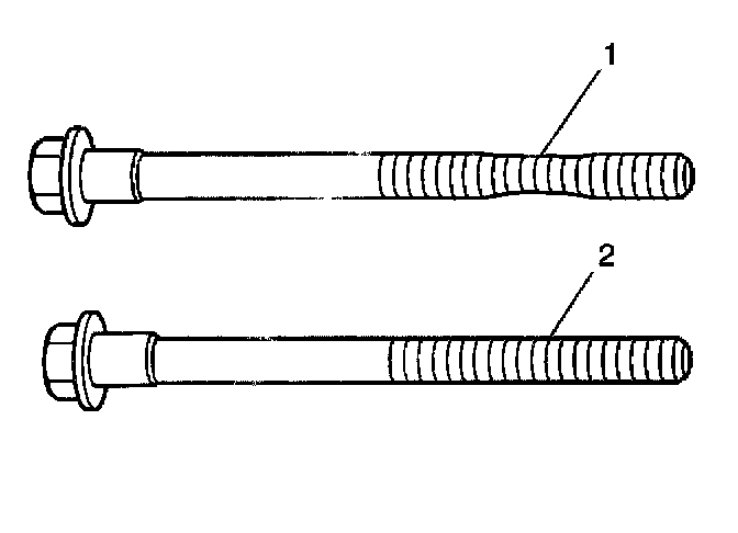 12. Inspect the connecting rod cap bolts for stretch (compare to known good bolt) (1) is a stretched bolt, (2) is a new or good bolt.