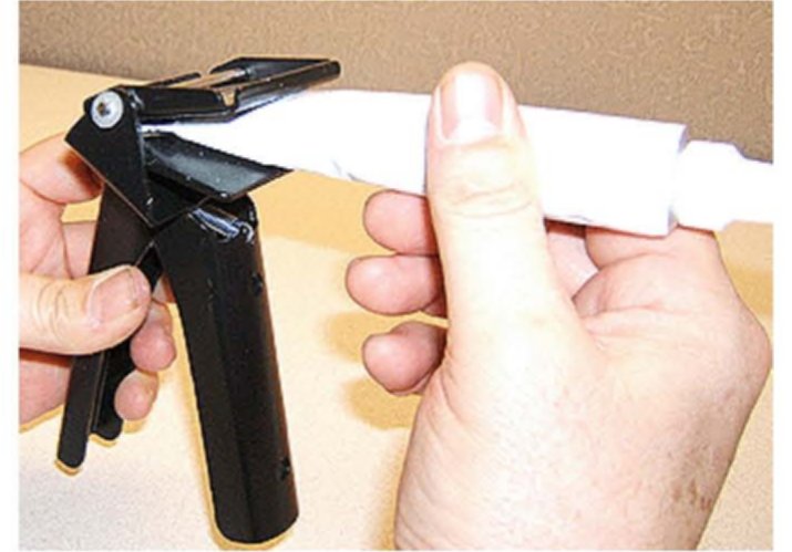 Install engine sealant 0.075 kg (75 gram) squeeze tube with a small piece of medium grit sandpaper into the dispenser (see above graphic illustration). Remember to open the squeeze tube with a sharp knife or equivalent and cut the sealant nozzle to the correct diameter to apply a 3 mm (0.118 in) even bead of sealant.