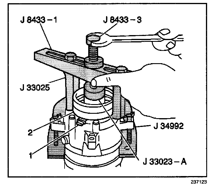 10. Tighten the J 8433-3 against the J 33023-A in order to remove the clutch coil (2).