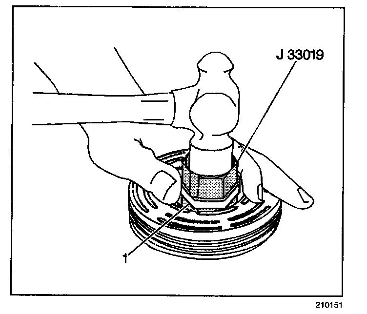 7. Using care in order to prevent injury, strike the staking pin of the J 33019. Properly position the stake pin in the guide after each impact on the pin.