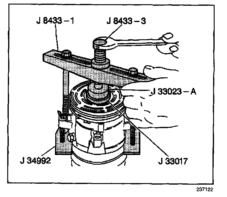 15. Tighten the J 8433-3 in the J 8433-1 in order to force the pulley rotor and bearing assembly onto the front head of the compressor.