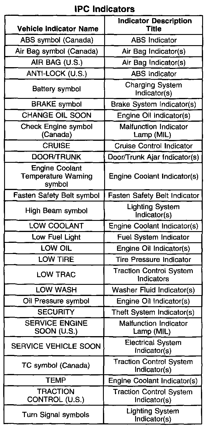 The indicator description and operation uses generic indicator names. Refer to the table for the indicators that are available on this vehicle: