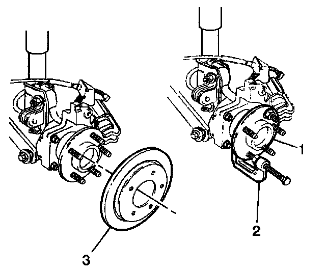 4. Remove the rotor (3). Refer to Brake Rotor Replacement - Rear in Brakes and Traction Control.
