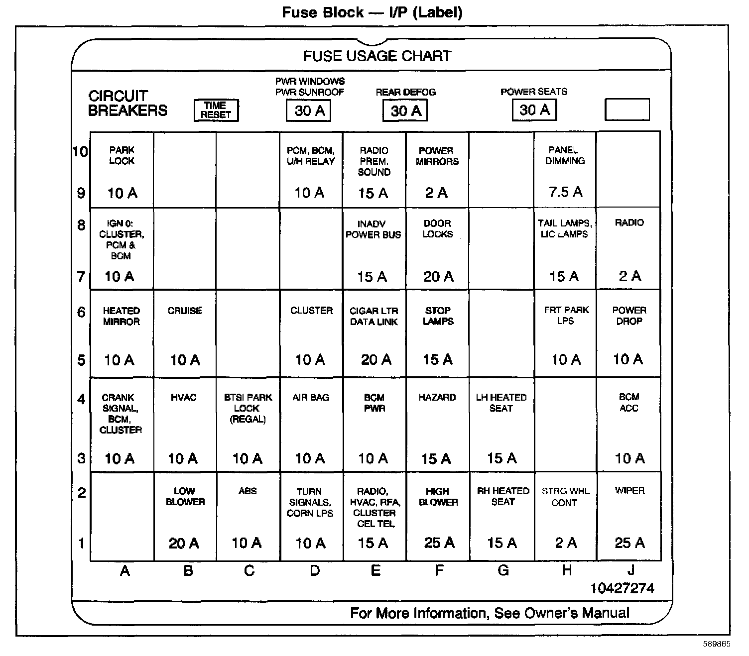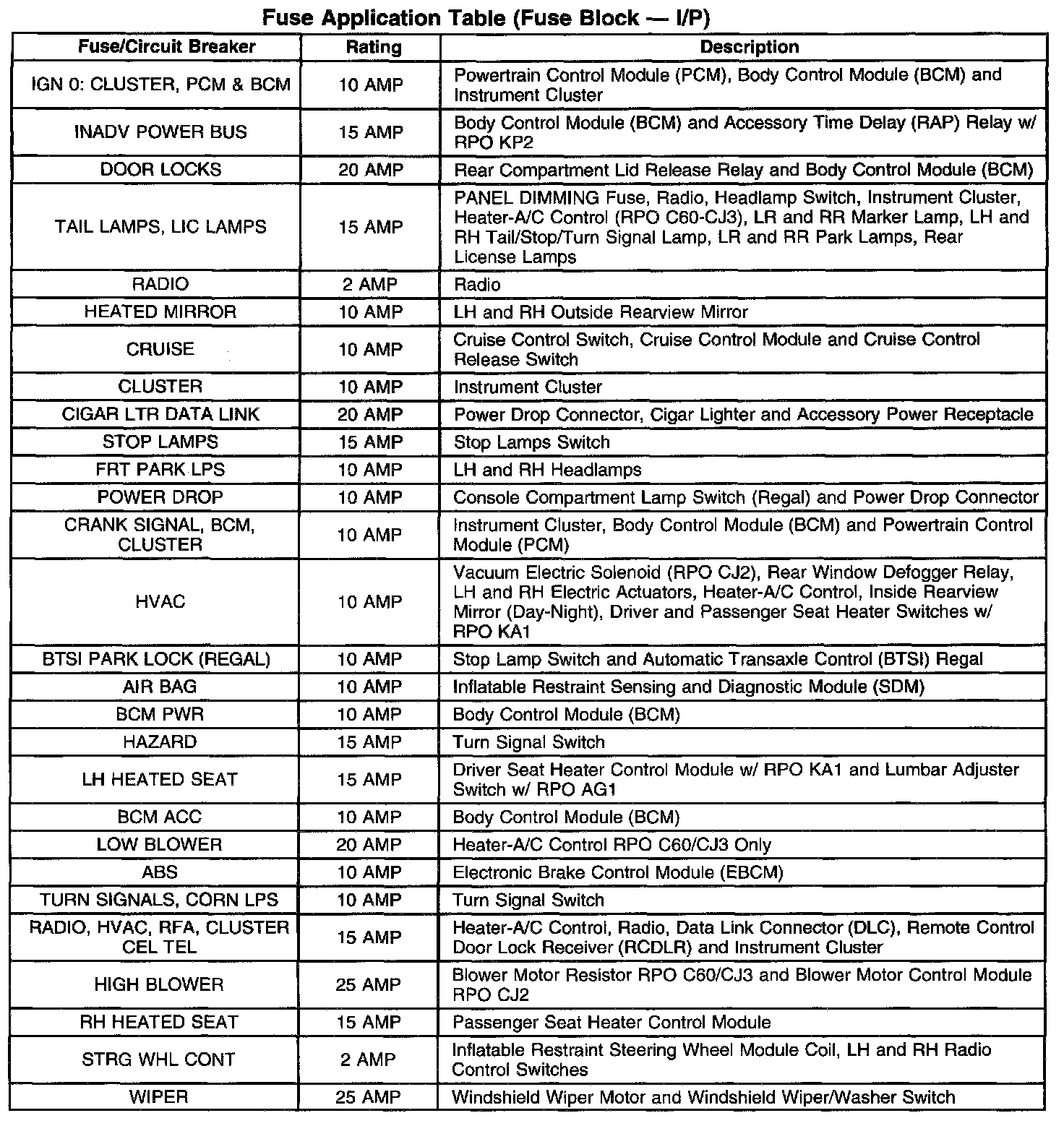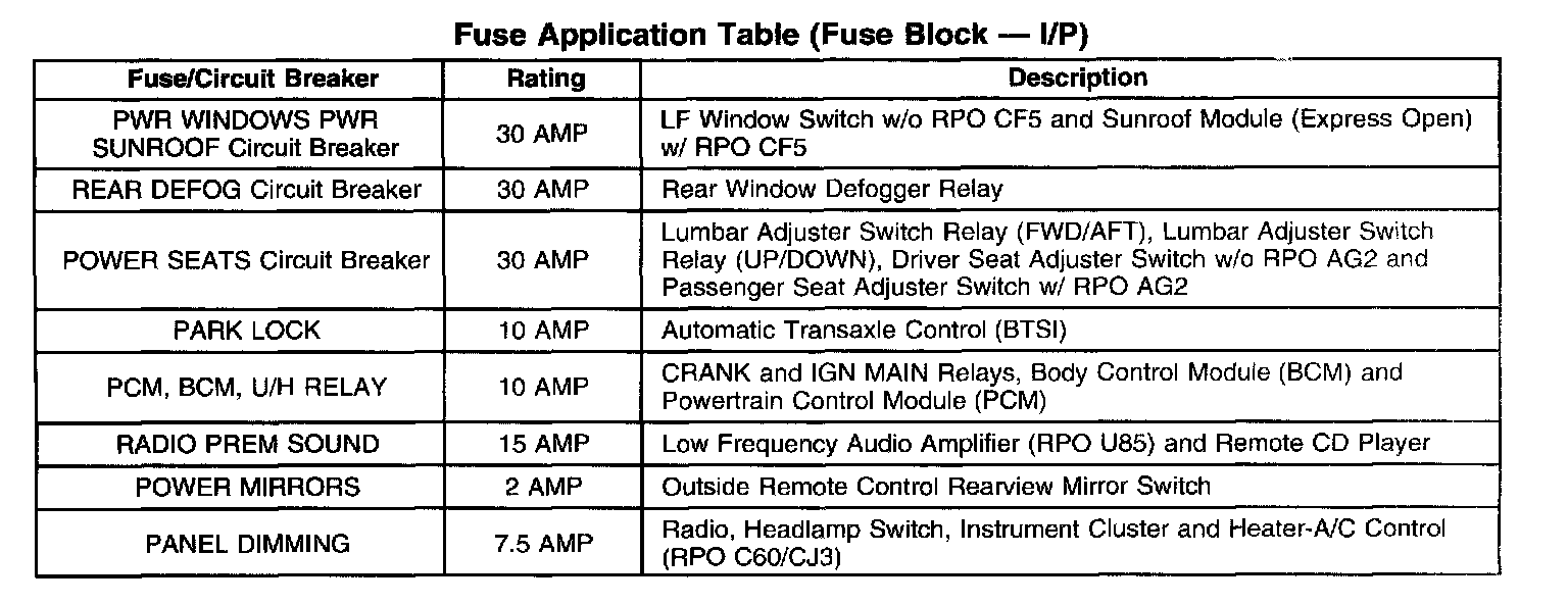 Fuse Application Table (Fuse Block - I/P) (Part 2 Of 2):
