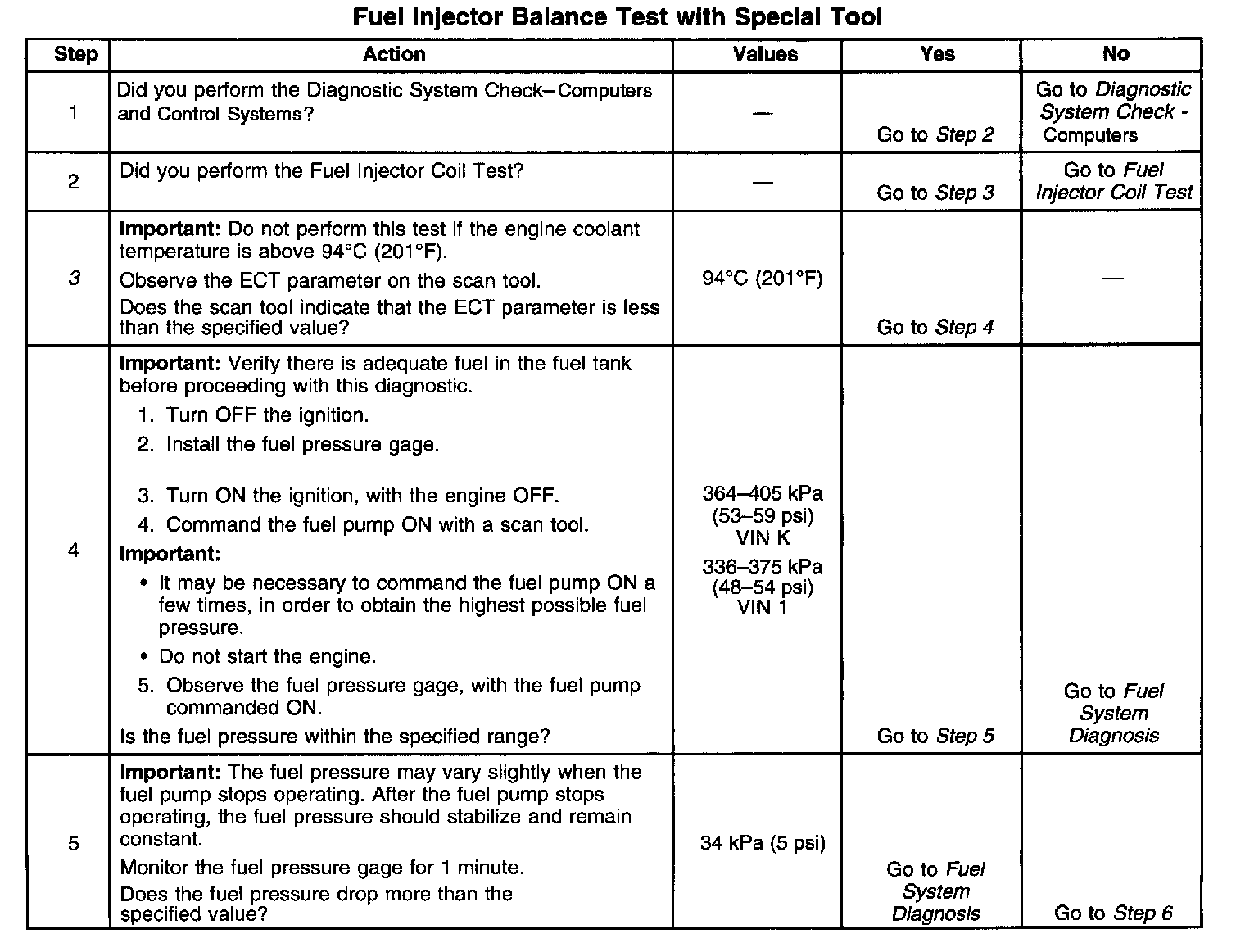 3. The engine coolant temperature must be below the operating temperature in order to avoid irregular fuel pressure readings due to hot soak fuel boiling.