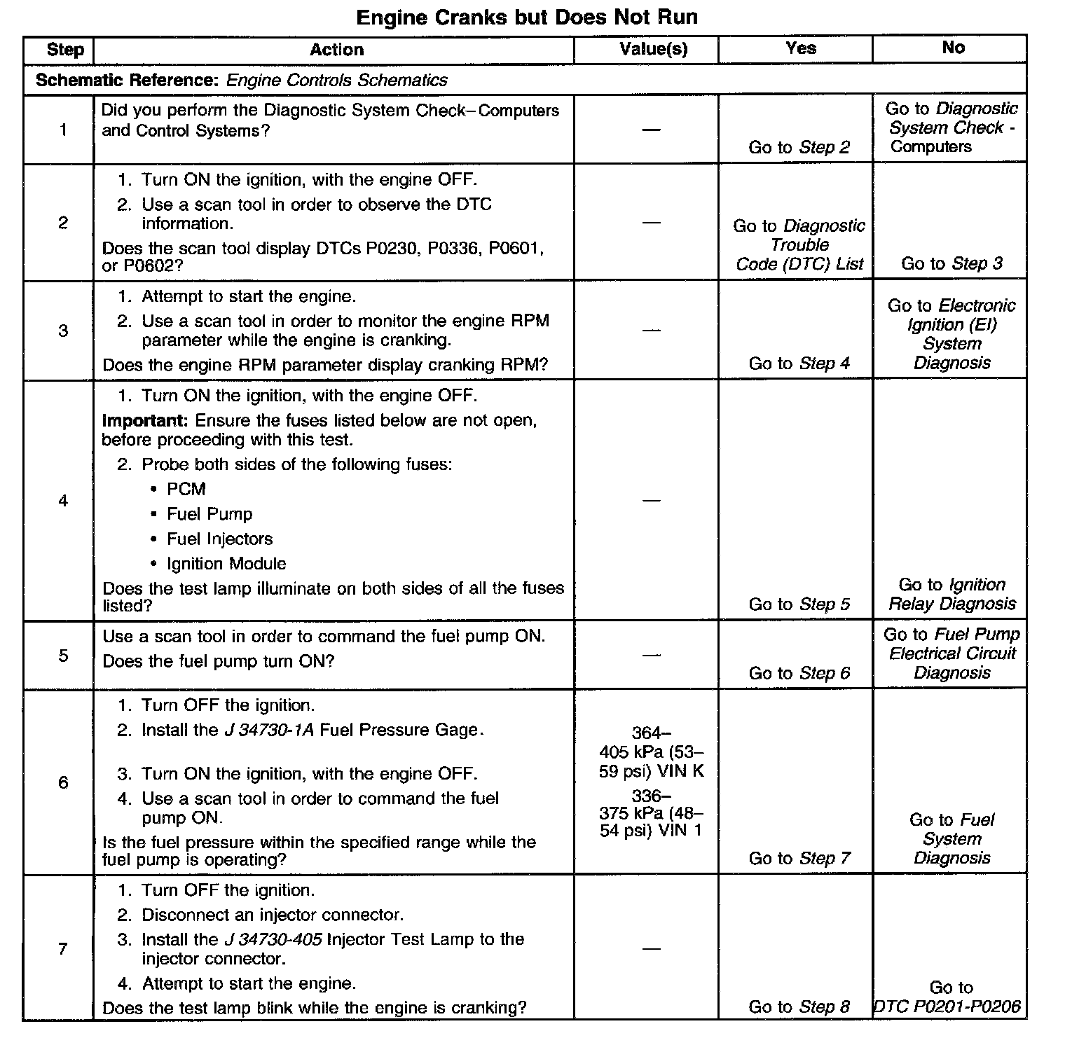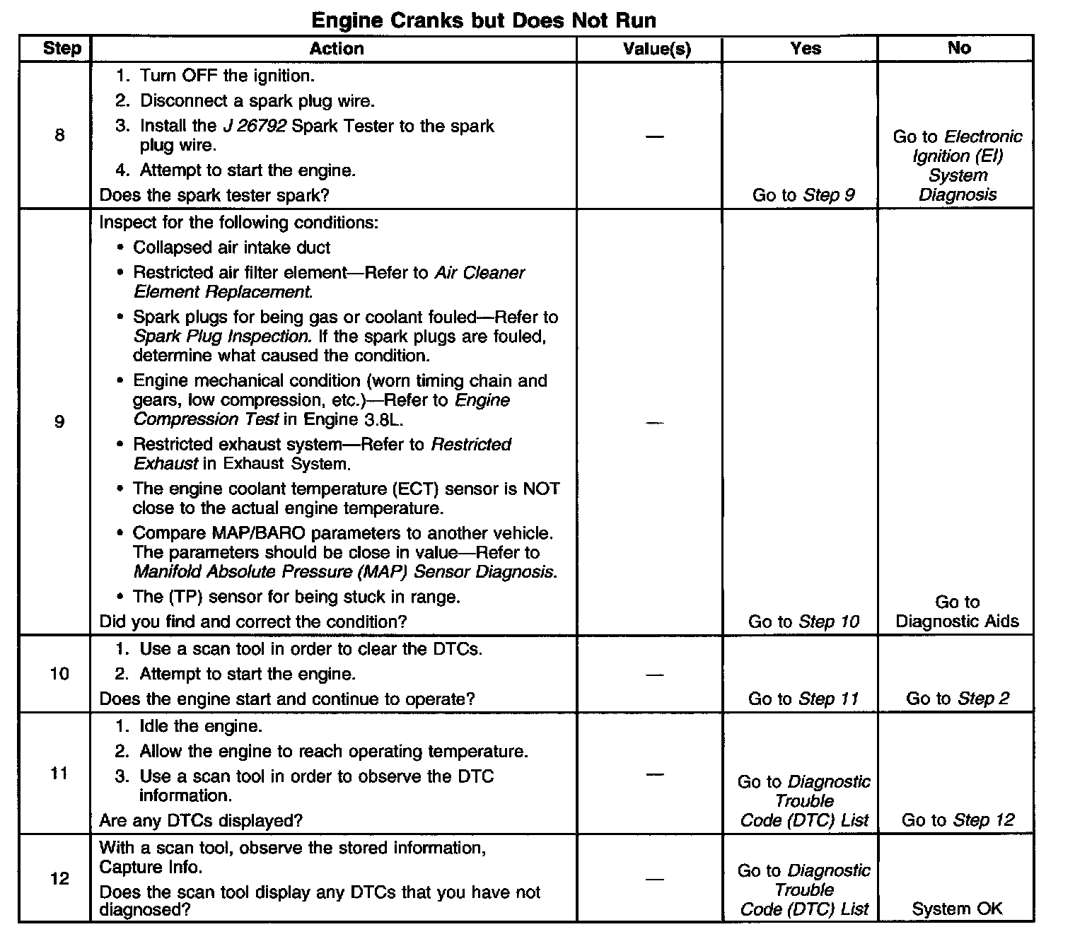 The table will isolate the failed system and lead to the correct diagnostic procedure.