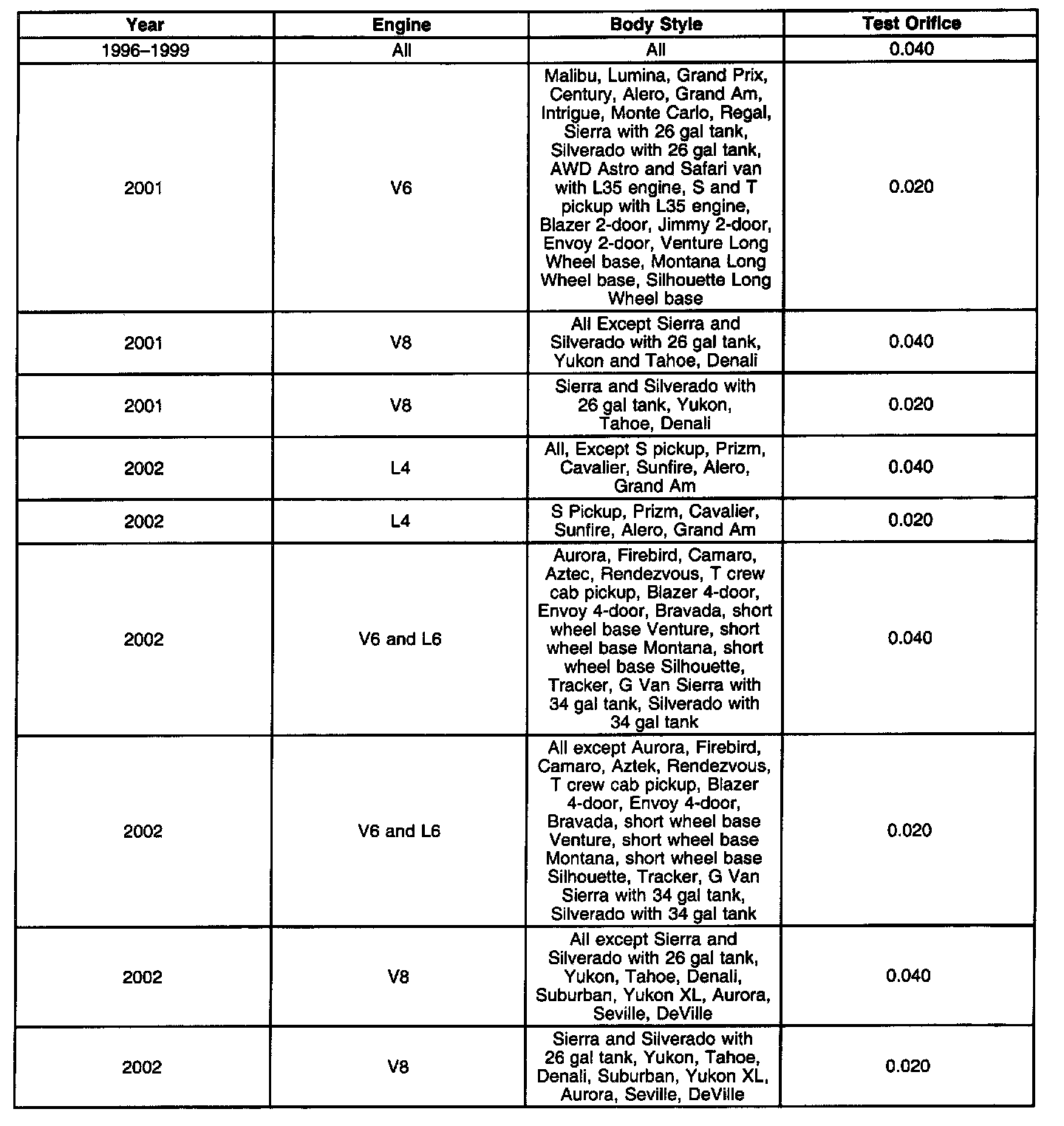 The chart shown should be used to select the correct orifice for the Verification Process if the Service information does not specifically list the information.