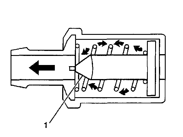 The primary control is through the crankcase ventilation valve (1), which meters the flow at a rate depending on inlet vacuum. To maintain idle quality, the crankcase ventilation valve restricts the flow when inlet vacuum is high. If abnormal operating conditions arise, the system is designed to allow excessive amounts of blow-by gases to back flow through the crankcase vent into the throttle body to be consumed by normal combustion.