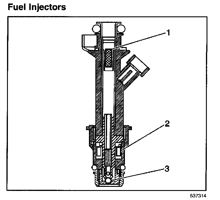 The fuel injector assembly is a solenoid operated device, controlled by the PCM, that meters pressurized fuel to a single engine cylinder. The PCM energizes the high-impedance (12.0 ohms) injector solenoid (2) to open a normally closed ball valve (3). This allows fuel to flow into the top of the injector, past the ball valve, and through a director plate at the injector outlet. The director plate has four machined holes that control the fuel flow, generating a spray of finely atomized fuel at the injector tip. Fuel from the injector tip is directed at the intake valve, causing it to become further atomized and vaporized before entering the combustion chamber. An injector stuck partly open can cause a loss of pressure after engine shutdown. Consequently, long cranking times would be noticed on some engines.