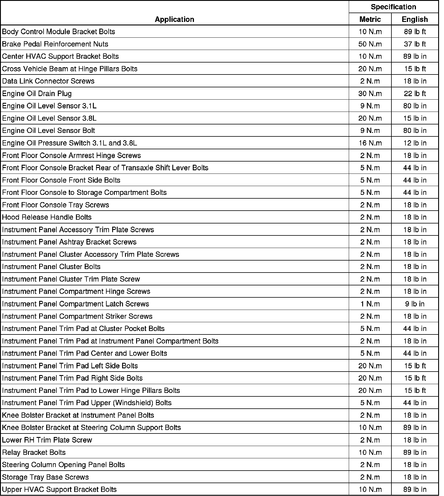 Fastener Tightening Specifications