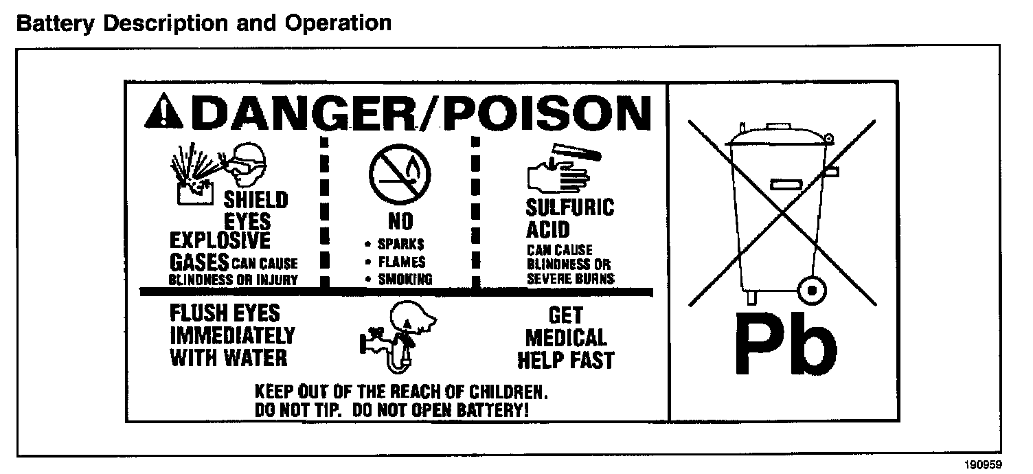 ^ Do not allow the battery electrolyte to contact the eyes or the skin. Flush immediately and thoroughly any contacted areas with water and get medical help.