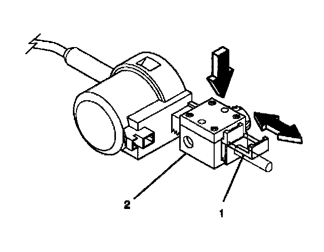 ^ Pull out the tab (1) on the adjuster block side (2) of the actuator.