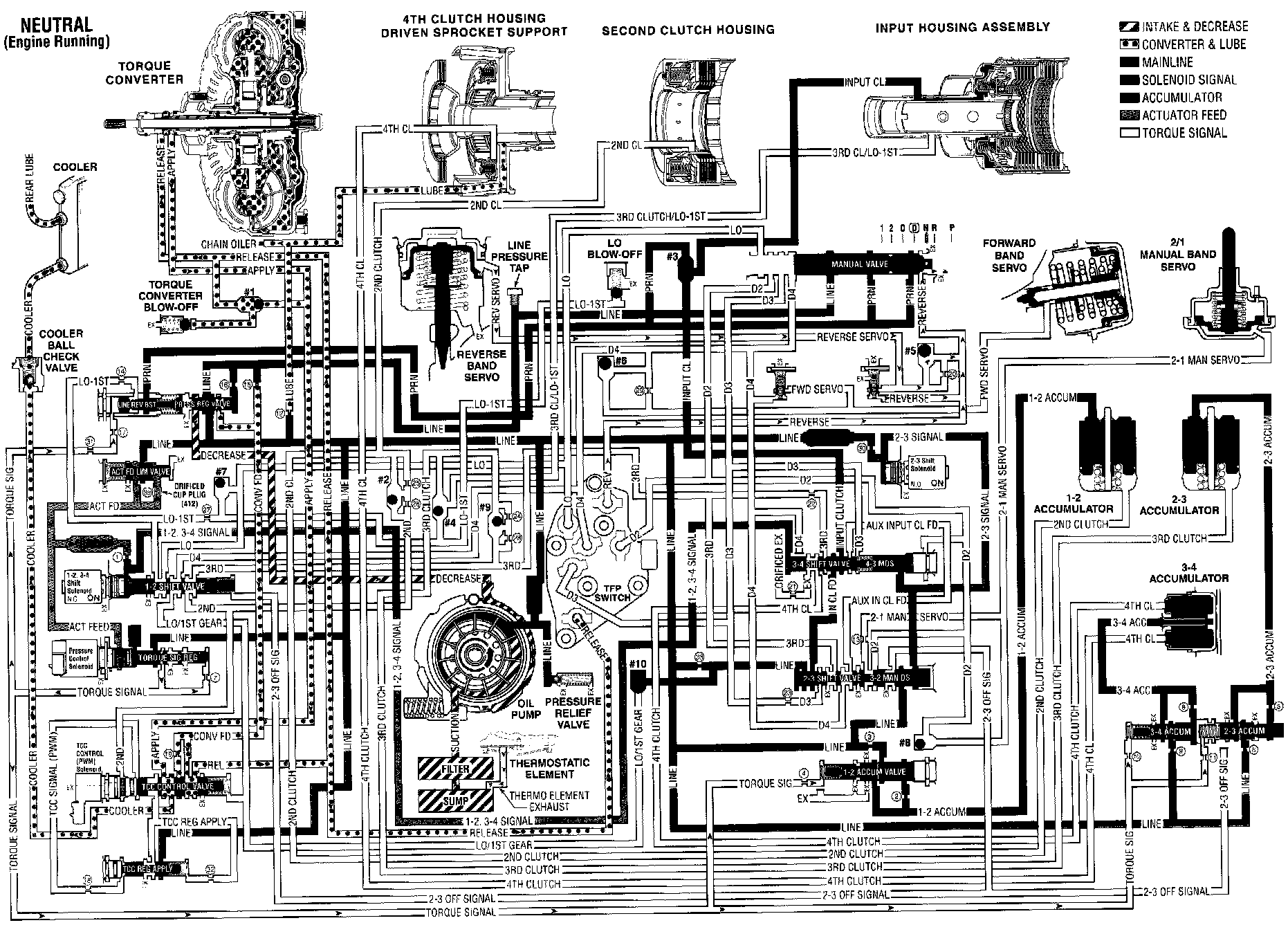 Reverse fluid pressure exhaust from the TFP manual valve position switch, thereby signaling the PCM that the transmission is in NEUTRAL (N) or PARK (P). The #5 ball check valve unseats, allowing reverse servo fluid to quick exhaust.