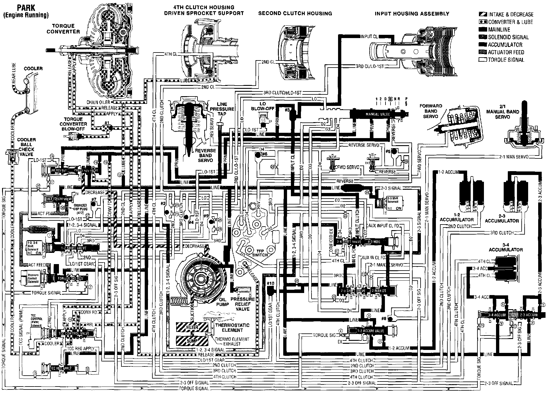 In PARK range, line pressure passes through the 2-3 shift valve (357) and line pressure feeds the input clutch feed passage. Line pressure then passes through the 3-4 shift valve (362) and around the #3 ball check valve (372), located in the case cover) in order to apply the input clutch. Although the input clutch is applied and the input sprag is holding, these conditions are not effective because neither the forward band assembly (688) nor the reverse band assembly (615) is applied.