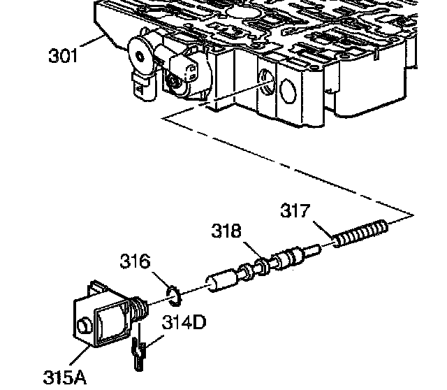 4. Remove the 1-2, 3-4 shift solenoid (SS) valve (315A), 1-2 shift valve (318) and 1-2 shift valve spring (317) from the control valve body (301).