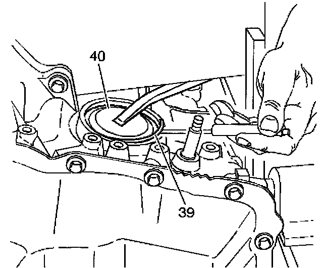 9. Use a long screwdriver in order to depress the reverse band servo cover (40) by prying against the transmission holding fixture.
