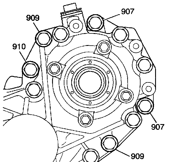 6. Remove the transfer case to case bolts (907, 909, 910).