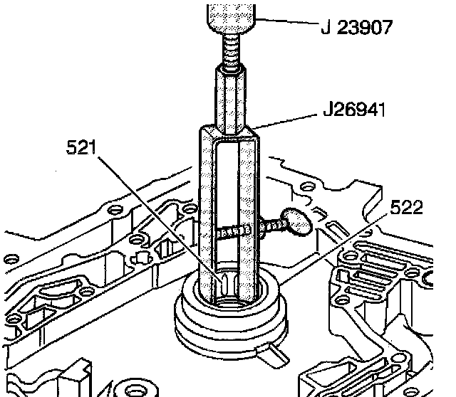 5. Use J 23907 and J 26941 in order to remove the bearing assembly (521) from the drive sprocket support.