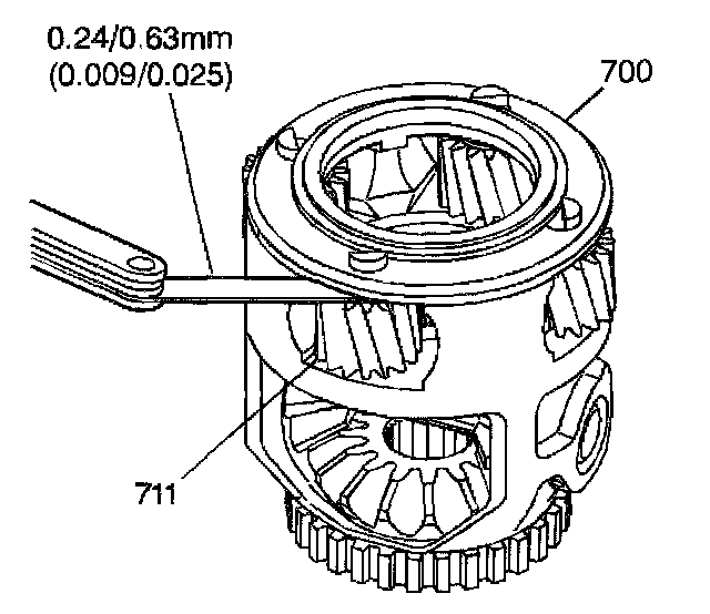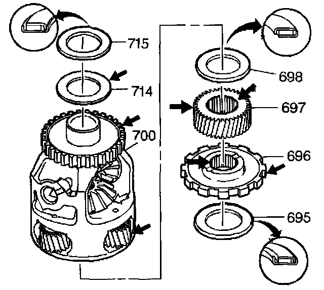 ^ Damaged internal gear/parking gear thrust bearing (695), differential carrier/sun gear thrust bearing (698) or differential carrier/case thrust bearing (715)