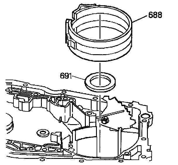4. Install the thrust washer (691) for the differential carrier internal gear into the case. Position as indicated.