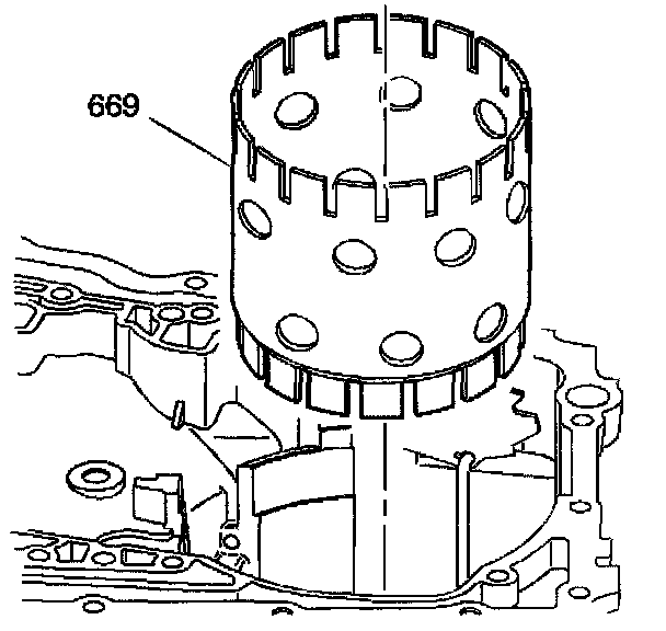 2. Install the reverse reaction drum (669) into the case and engage the drum onto the input carrier splines.